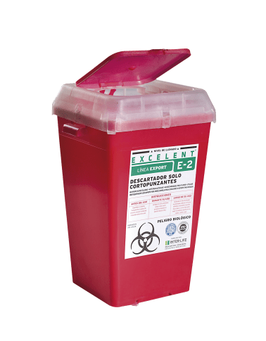 Descartador de residuos patógenos y cortopunzantes. Capacidad 2L. Construido en polipropileno rígido virgen y traslúcido, resistente a caídas y perforaciones Paredes que superan la exigencia de las normas. Con cobertor de encastre inviolable.